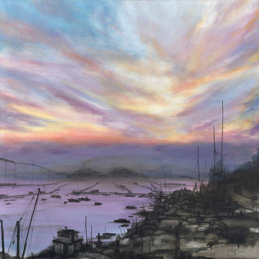 《石鼓洲焚化爐運輸系統》呈現了一個海港景色,奇異的天空佔據了構圖的近三分之二。天空的廣闊空間展示了對雲層的精湛渲染,這些雲層以明亮的粉彩色系——淡紫色、淺藍色、粉紅色和金黃色——排列成戲劇性的、一氣呵成的圖案,暗示著運動和大氣深度。在這片壯觀的天空之下,有一片水體,呈現出柔和的紫色和藍色,形成了一個反射面,使整個構圖融為一體。下部描繪了一個港口,港口停泊著許多船隻(小船和大船),在淡紫色的水面上呈現出陰影的輪廓。構圖的右側是海岸線,有碼頭、船桅杆以及看似控制塔或小型建築的建築,全部用精緻的線性元素和大氣的水墨渲染而成。遠處的山脈或基礎設施元素形成了微妙的地平線,而整體色調從天空的鮮豔溫暖過渡到前景中更冷、更柔和的色調。繪畫將精確的觀察元素與大氣效果結合,創造出介於紀實風景與情感反應之間的場景。