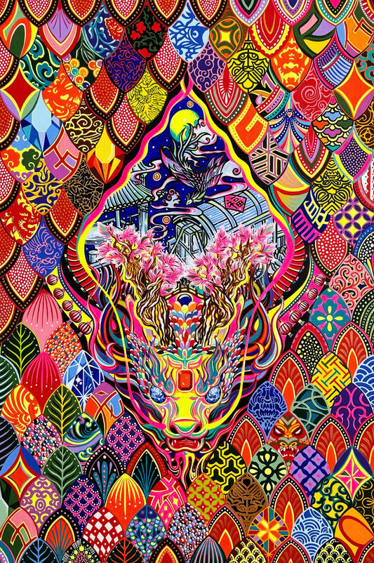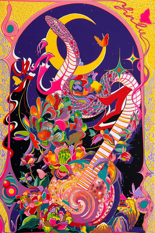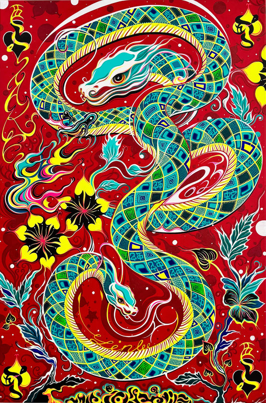 在這件作品中,蛇和月亮被解釋為代表重生和轉變的強大象徵。在各種文化信仰和神秘實踐中,蛇常常與數字六聯繫在一起,而古代文明則將它們視為智慧和神秘力量的象徵。 這些特徵也與數字「6」的象徵意義一致,數字「6」在眾多哲學傳統中具有深遠的意義,代表和諧、愛和幸福。此外,這件藝術品還採用了複雜的中國書法「蛇」、與蛇交織在一起的月亮形古琴、一座微型中國寺廟和中國十大名花之一的牡丹。透過融合這些元素,一張迷人而復古的撲克牌被賦予了生命。