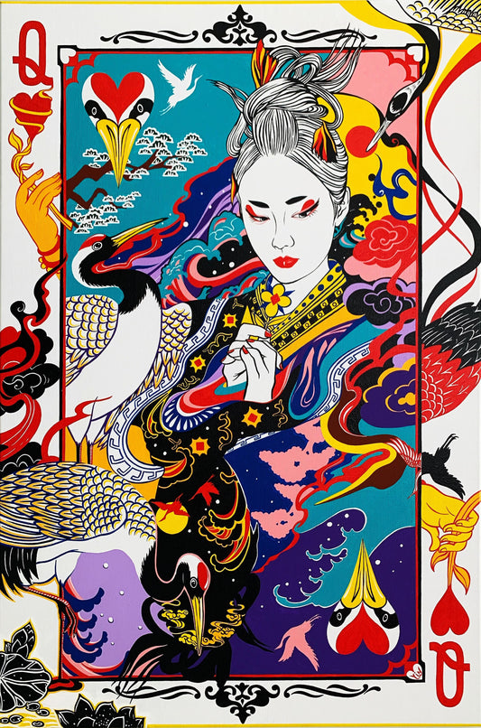 在傳統的 54 張牌中,紅心皇后作為首張牌享有崇高的地位。 在塔羅牌占卜領域,這張牌體現了一位強大而有影響力的女性的本質,散發著帝王的權威和不可否認的存在。紅心皇后以她的養育本性和對所愛之人堅定不移的保護而聞名,經常預示著尋求指導的個人將進入復原力和賦權的階段。 值得注意的是,丹頂鶴的形象,既佇立在女王身邊,又優雅地翱翔於天空,蘊含著吉祥、自由、生命力持久的深刻內涵。這張卡片從豐富的中國神話和民間傳說中汲取靈感,賦予其深厚的藝術意義。