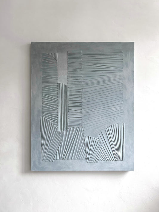 單色天藍色木材上的礦物灰泥,採用 Elsa Jeandedieu 的標誌性紋理技術 “Oscillation” 創作。 紋理藝術作品講述森林的柔軟有機紋理,見證朦朧的城市天際線。