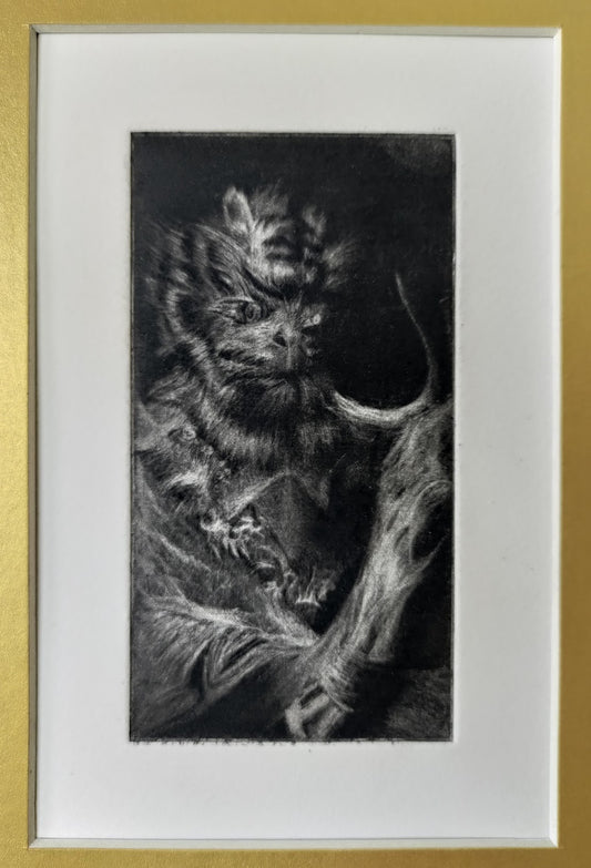 在創作我的第一幅美柔汀版畫時,我發現了自己在這一技法上的天賦。這幅小型美柔汀版畫體現了我對探索版畫、素描和繪畫之間關係的熱情。我的靈感來自古代阿卡迪亞神潘——荒野與自然之神。然而,我選擇打破傳統形象,將人類形象替換為野生動物老虎,以此作為我自畫像的鏡像。在黑暗中,隱約可見的生物象徵著瀕臨滅絕的狀態,正如在我們統治下,大自然不斷從地球上消失一樣。儘管這些生物難以捉摸,但它們無處不在,始終存在於我們的世界中。終有一日,這片土地上的死亡之神潘將再次復活,重新建立它的統治;屆時,我們將感受到它復甦時所帶來的憤怒。